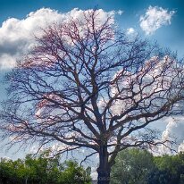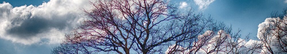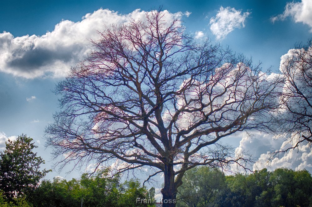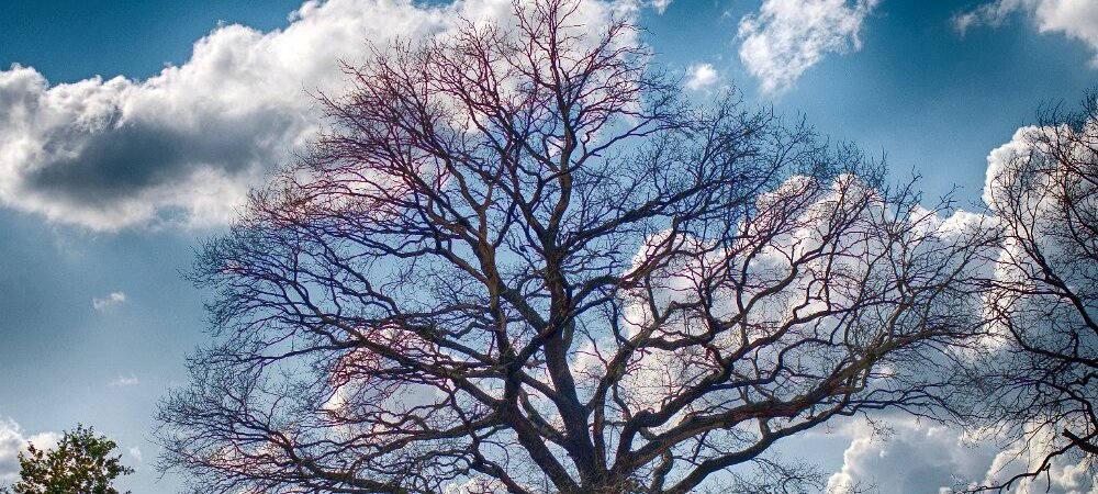 Das majestätische Gerüst eines Baumes ragt vor einem dramatischen Himmel empor, seine kahlen Äste erzählen Geschichten vergangener Jahreszeiten und…