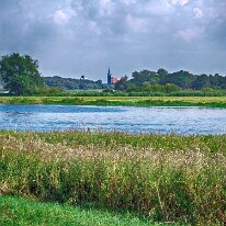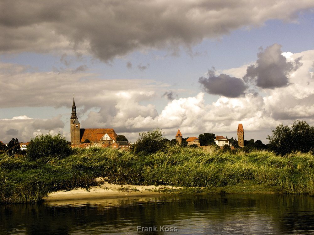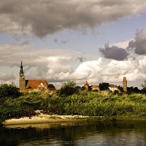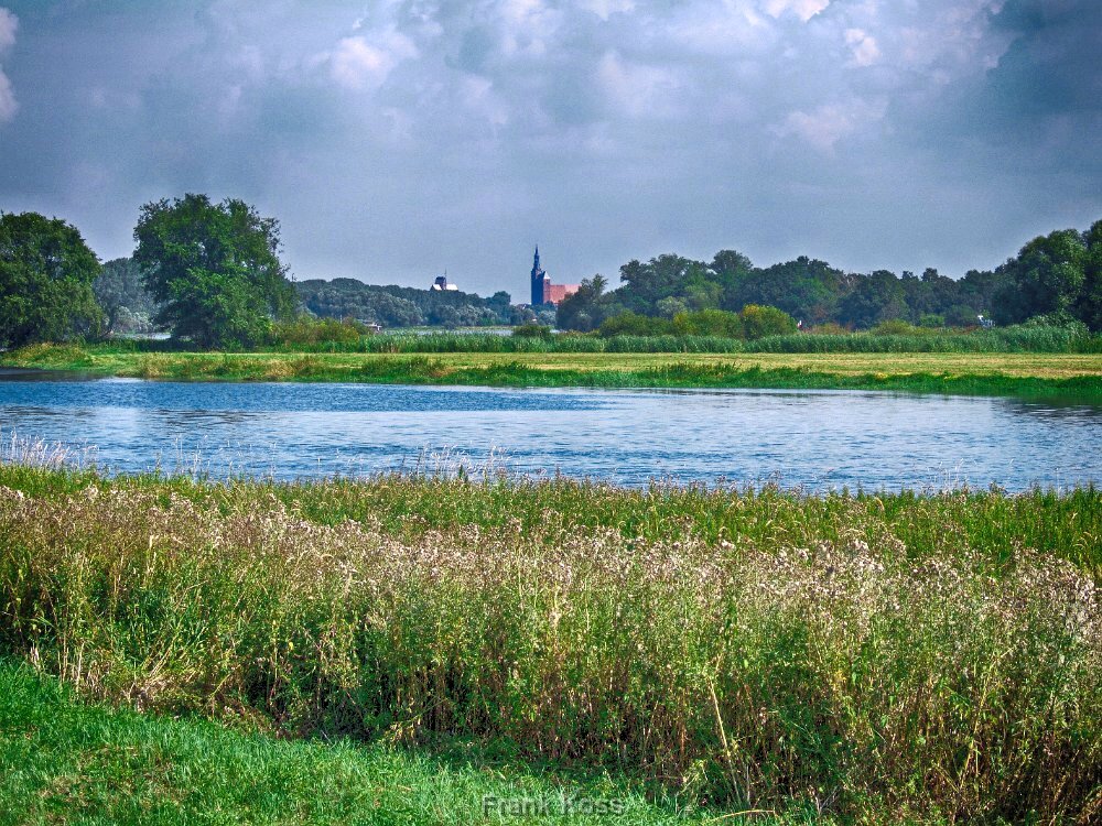 Ein Blick über die Elbauen auf Tangermünde, die Kaiserstadt an der Elbe. Im Zentrum: die markante St. Stephanskirche.