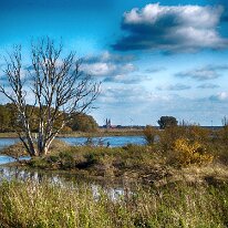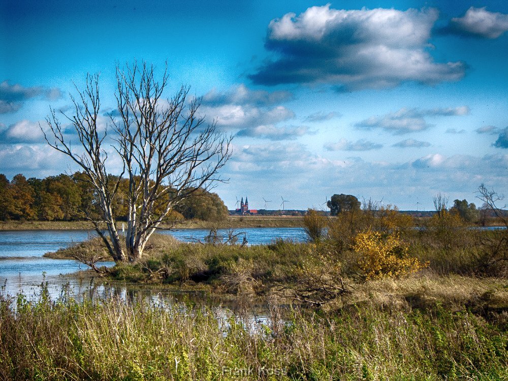 Ein einsamer Baum am Ufer, umgeben von wilder Natur – im Hintergrund erhebt sich majestätisch der rote Backsteinbau vom Kloster Jerichow. Ein Bild zwischen…