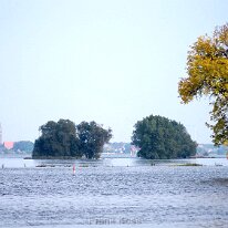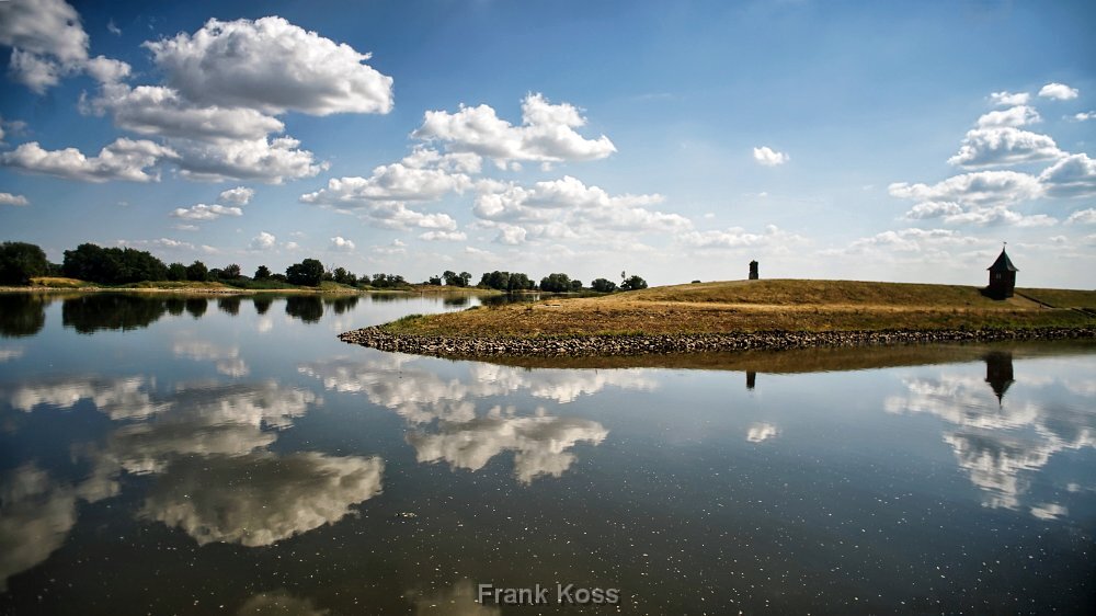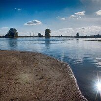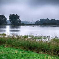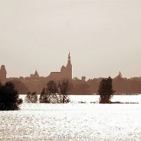 Jerichow bei Hochwasser: Die Elbe verwandelt die Landschaft in eine weite Wasserfläche. Im Hintergrund thront das imposante Kloster Jerichow.