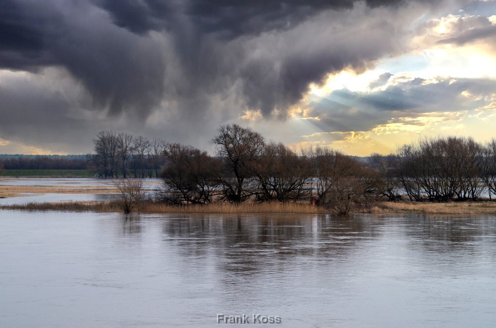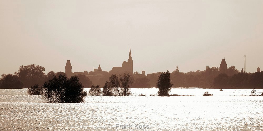 Die Elbe wird zur Bühne: Tangermünde im sepiafarbenen Licht der Flut. Ein Moment, in dem die Silhouette der Stadt Ehrfurcht einflößt.