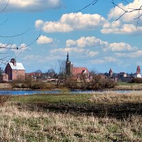 Tangermünde im Frühling: Blick auf die historische Altstadt mit der St. Stephanskirche und der Burg, über die gelb-grünen Elbwiesen.