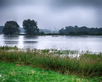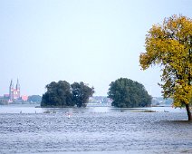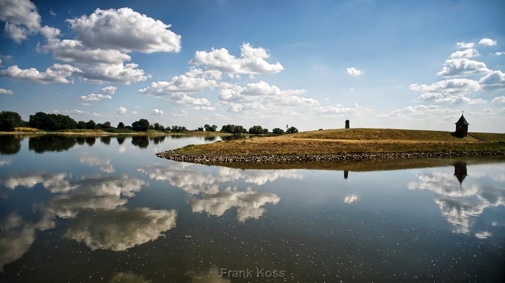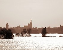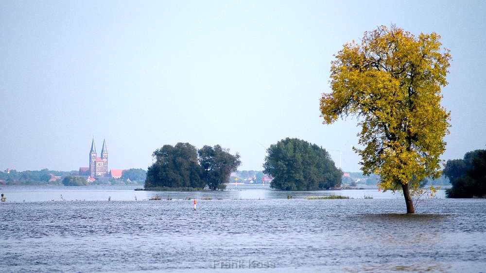 Jerichow bei Hochwasser: Die Elbe verwandelt die Landschaft in eine weite Wasserfläche. Im Hintergrund thront das imposante Kloster Jerichow.