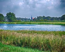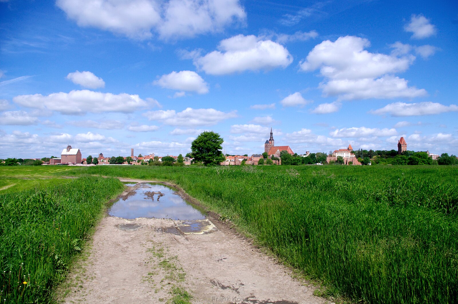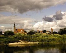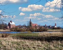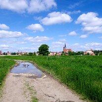 Ein Blick über die Elbauen auf Tangermünde, die Kaiserstadt an der Elbe. Im Zentrum: die markante St. Stephanskirche.