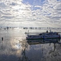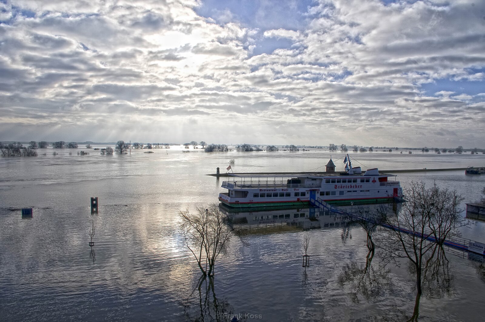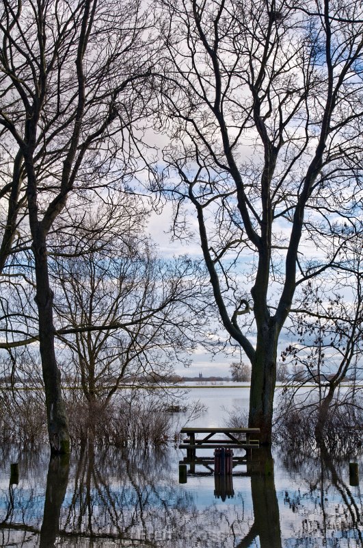 Die Ruhe der Überschwemmung, in der die Welt sich spiegelverkehrt im Wasser neu findet und ein alter Treffpunkt im Element versinkt.