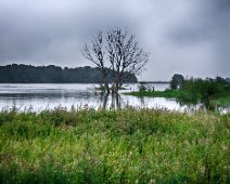 Ein einsamer Baum ragt aus dem ruhigen Wasser, umgeben von üppigem Grün, das die Stille der Natur widerspiegelt.