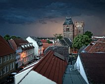Tangermünde bei Nacht: Die historischen Mauern im warmen Schein der Laternen, während der Vollmond durch die Wolken bricht. Ein unvergesslicher Moment.